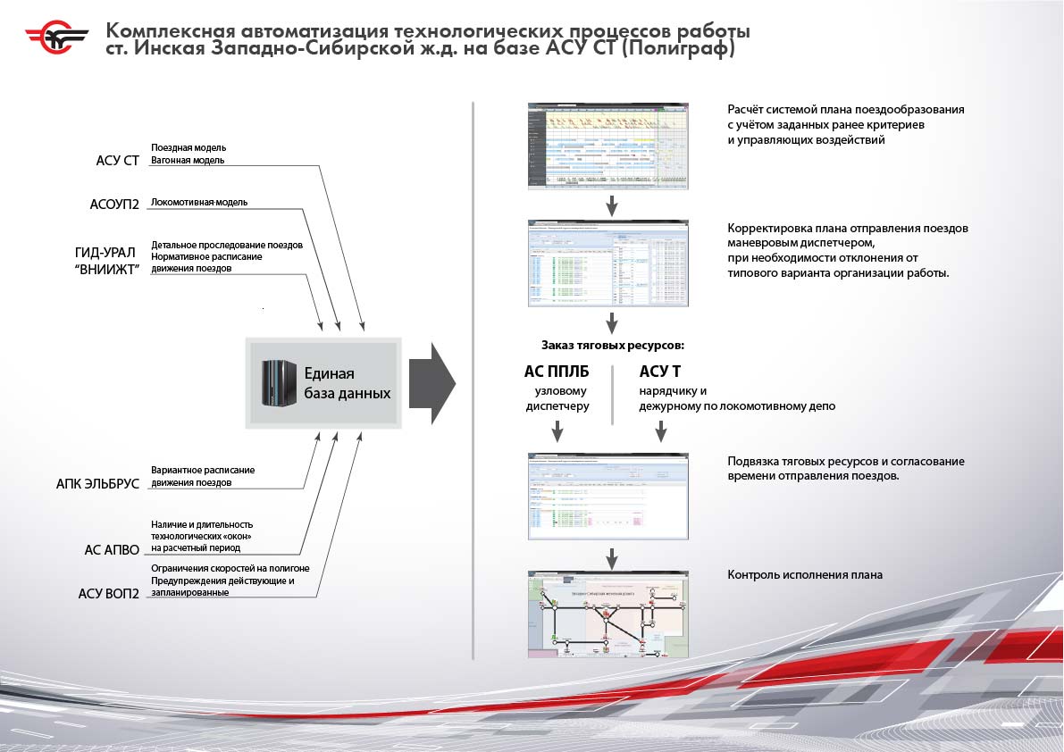 В 2013 году осуществлено внедрение принципиально нового подхода к планированию поездообразования на станции Инская Западно-Сибирской ж.д. Новая подсистема "Полиграф" в АСУ СТ версии 2013 года реализует автоматический обмен данными с целым рядом смежных информационных систем, таких как ГИД «Урал ВНИИЖТ», АПК Эльбрус, АСОУП-2, АС АПВО и позволяет рассчитать план готовности поездов на станции в полностью автоматическом режиме на глубину до 24 часов.
